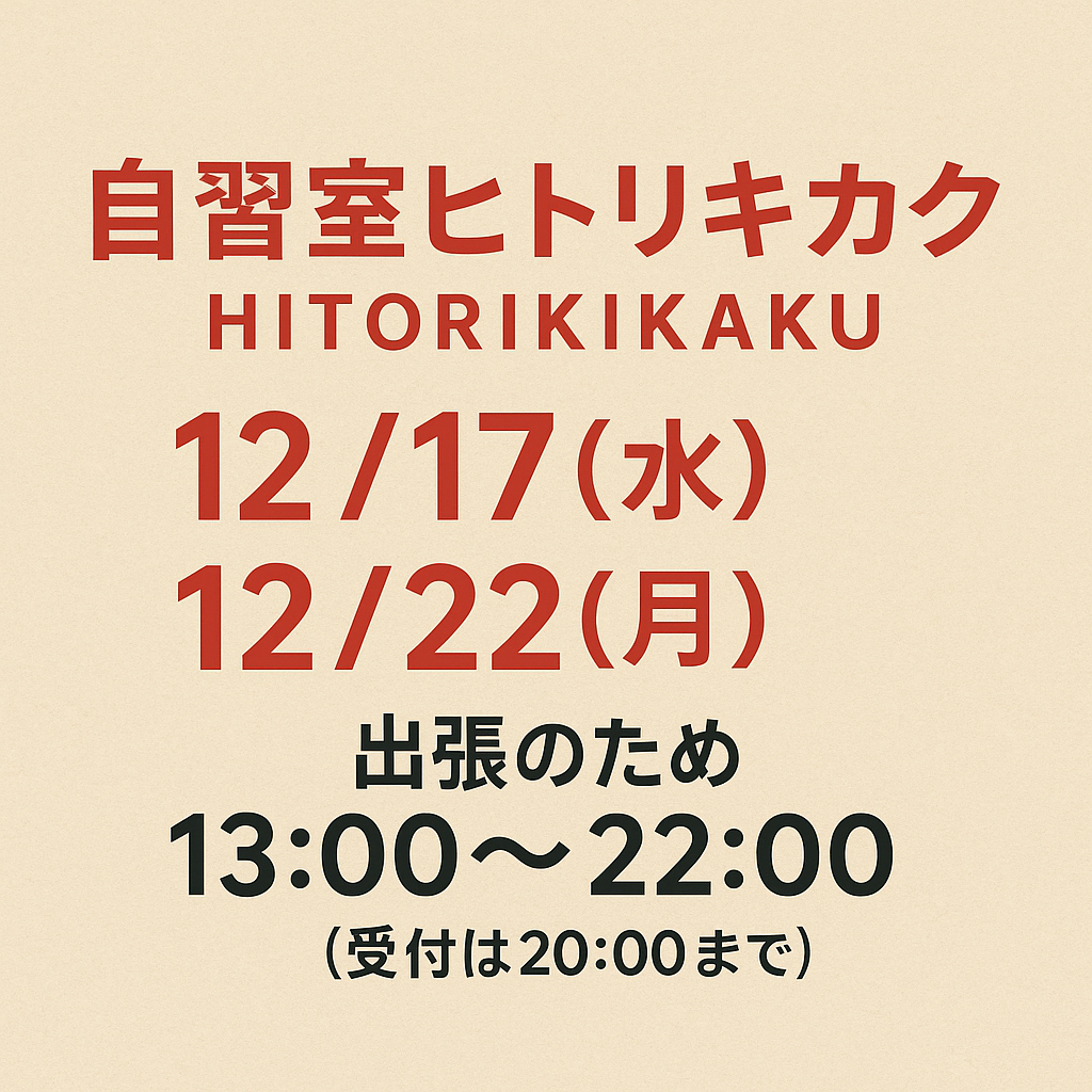 12月17日(水)と12月22日(月)は出張のため、営業時間を13:00からに変更させていただきます。